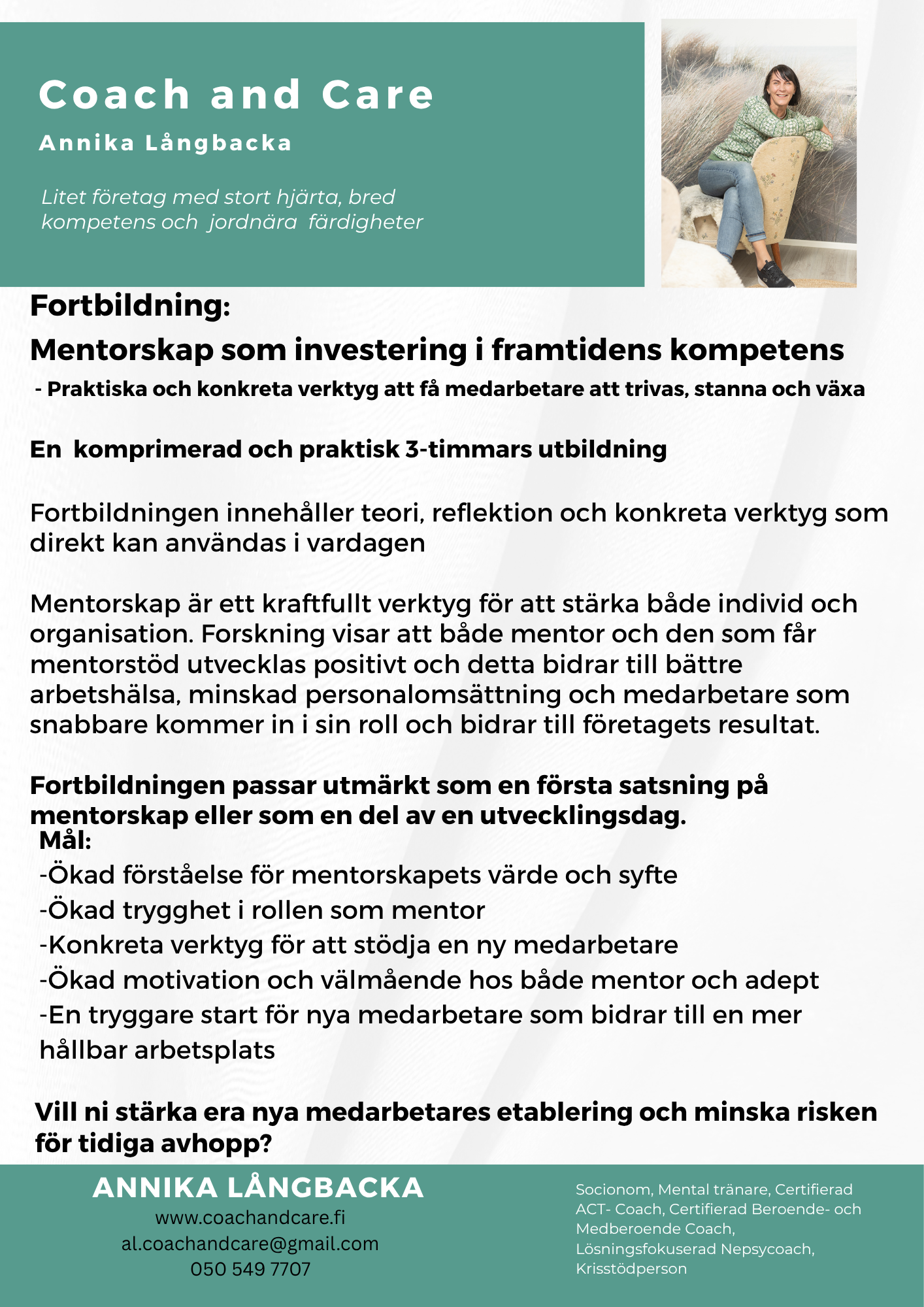 “Annika är positiv och energisk person som föreläsare. Mentor utbildningen var givande och innehållet var bra . Vi hade mycket bra diskussion i gruppen vilket gjorde att vi fick ta del av andras erfarenheter och perspektiv. Rekommenderar verkligen skolningen.“